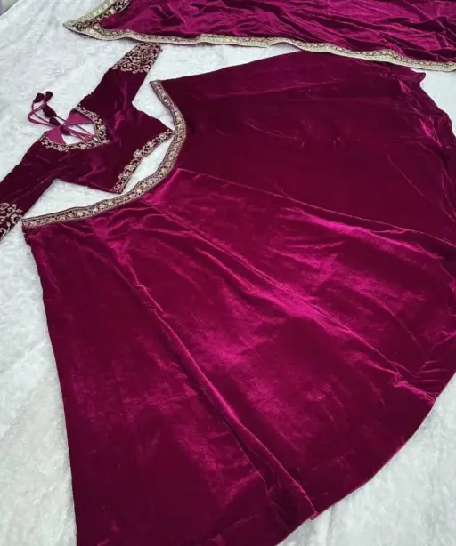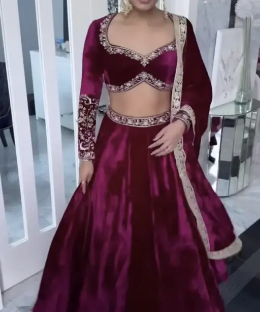 | Lehenga | 11000 velvet fabric with sequins, dori, and zari thread work, 3.75-meter flair, CAN CAN attached |