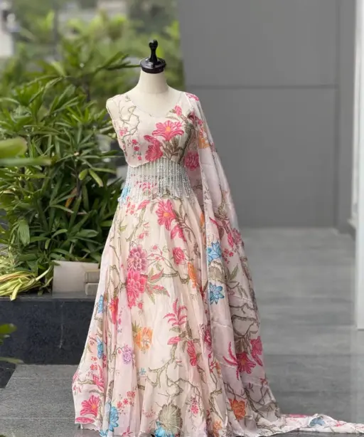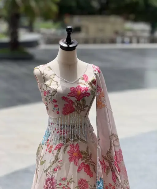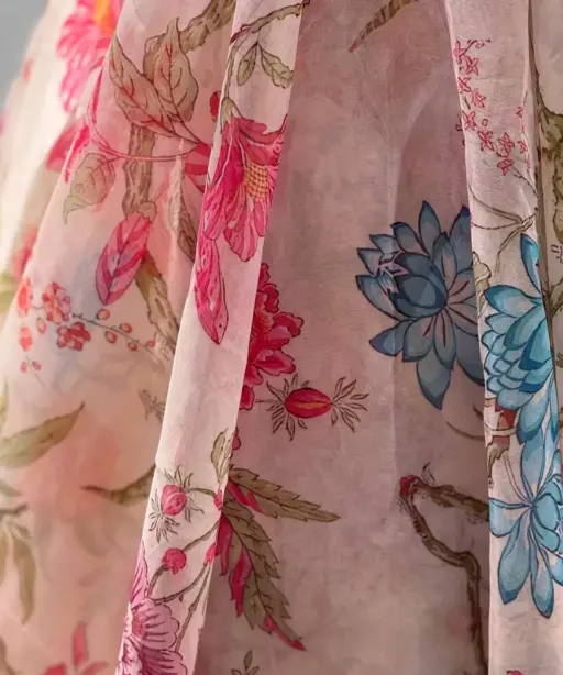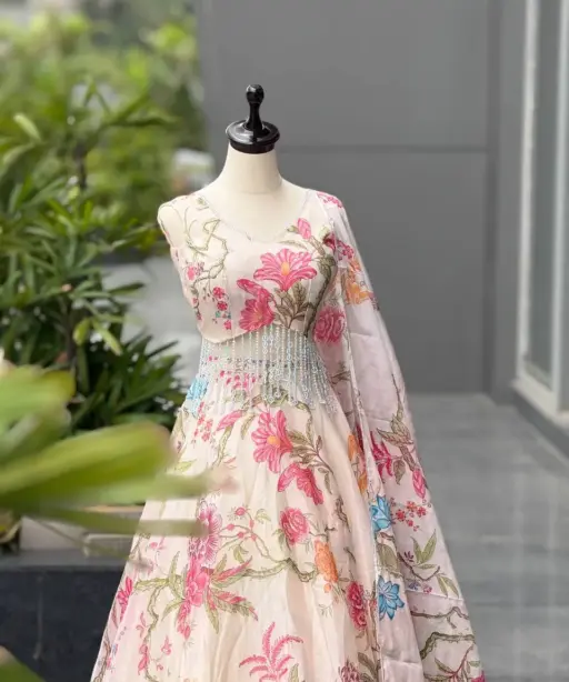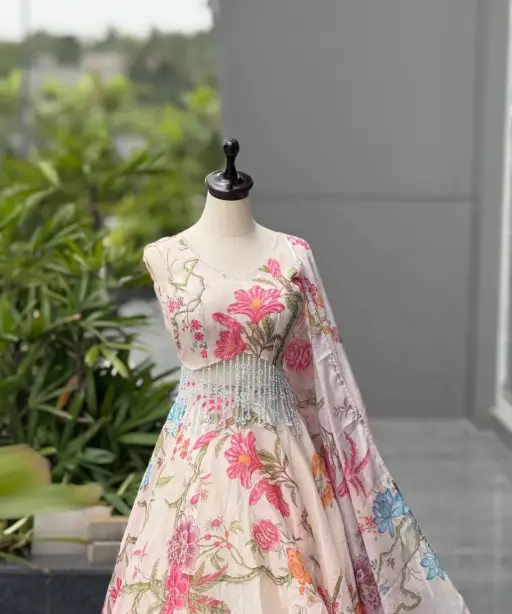 | Lehenga | Pure Jimmy Organza with Digital Print & Handcrafted Work Pure Jimmy Organza Digital Printed 8 Meter Flair Lehenga with Canvas Patta, Can-Can, and Adjustable Waist Dori |