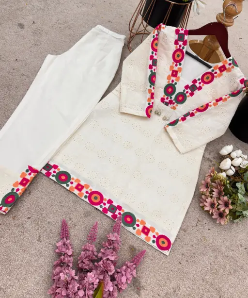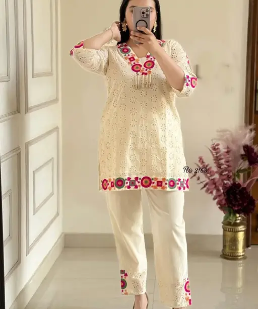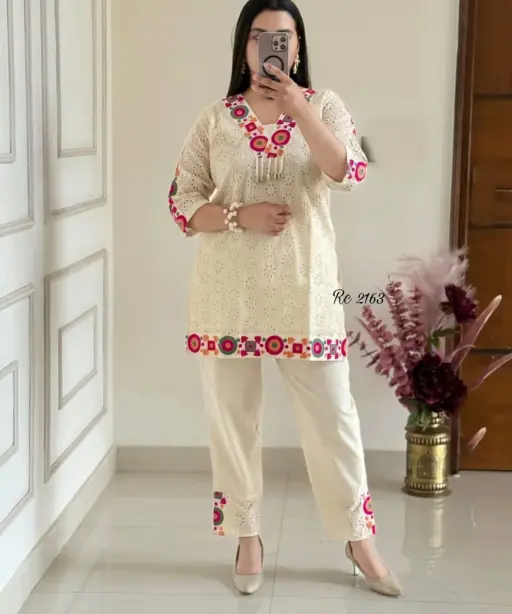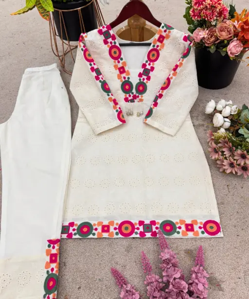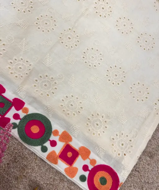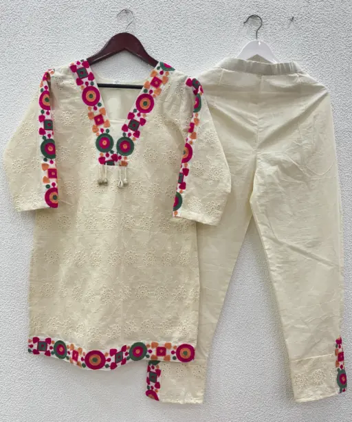 | Bottom | Pure Khadi Cotton with Schiffli Thread Work, Pant Length 37-38 inches |