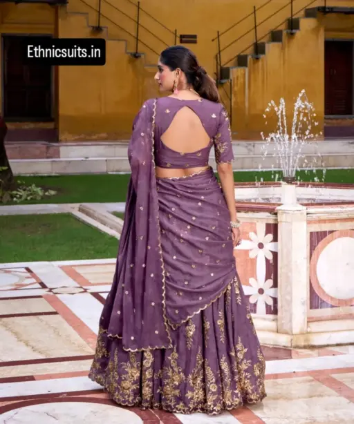 Lehenga: Chocolate Crush with Sequins and Thread Embroidery Work Stitched | Waist Supported up to 42 | Drawstring with Zip | Canvas & Can Can Attached | Length 41 | Flair 3.50 Meter | Inner: Micro Crepe