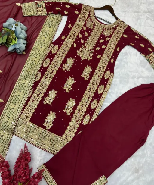 | Top | Faux Georgette with Fancy Heavy Embroidery, Sequins, and Riveted Moti Work (Front Side Only) Inner: Micro Cotton Length 46-47 Inches Size XL (42 Free Size) with XXL Margin (Fully Stitched) |