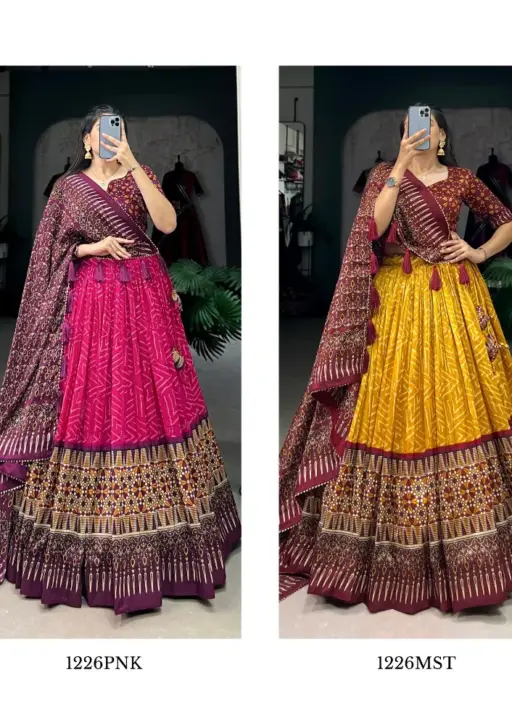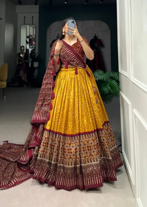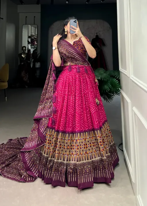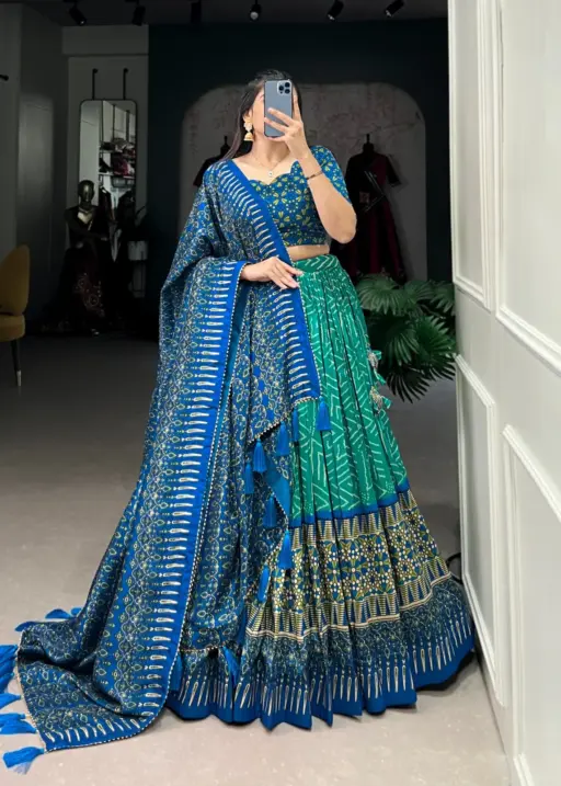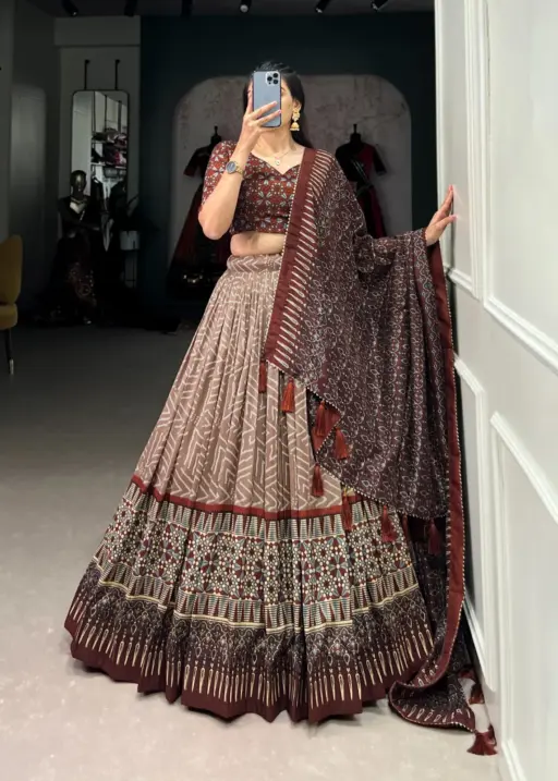 | Lehenga | Tussar Silk with Bandhej and Ajarakh Print |