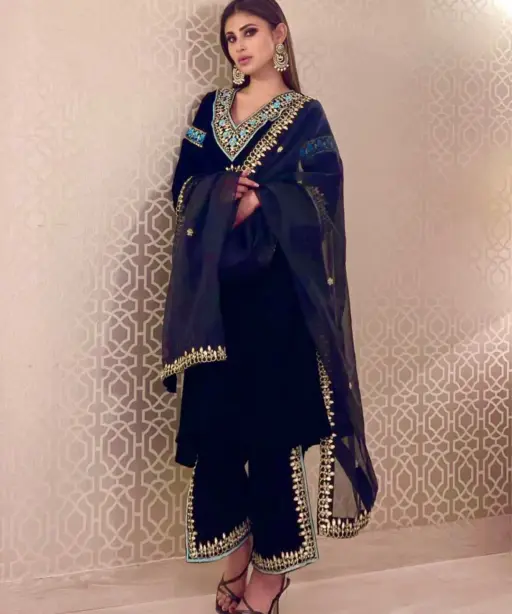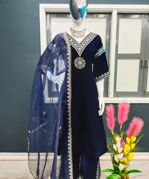| Bottom | Heavy Pure Viscose Velvet With 5mm Sequence Embroidery Work, Fancy Style Bell Bottom Cut, Length: 37-38 inches (Full Stitched) |