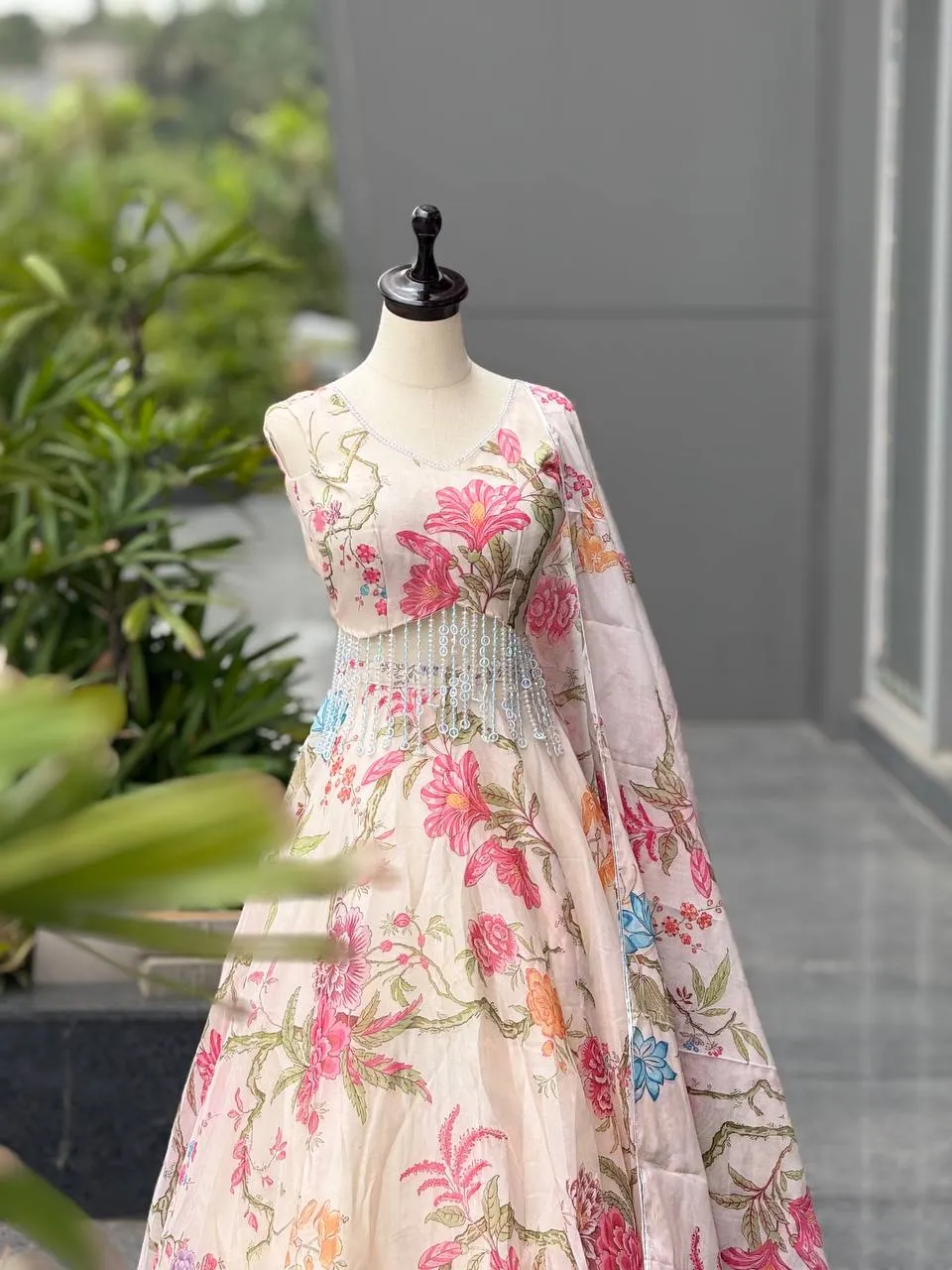 | Lehenga | Pure Jimmy Organza with Digital Print & Handcrafted Work Pure Jimmy Organza Digital Printed 8 Meter Flair Lehenga with Canvas Patta, Can-Can, and Adjustable Waist Dori |