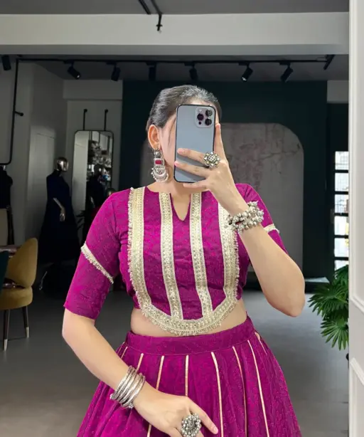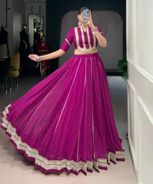 | Lehenga | Chiffon, Micro Crepe Chiffon With Bandhej Print, Sequins & Gotta Patti Lace Touch Up; Stitched With Canvas & Full Inner; Waist Up To 42; Length 41; Flair 8 M; Inner Micro Crepe; Closure: Drawstring With Zip |
