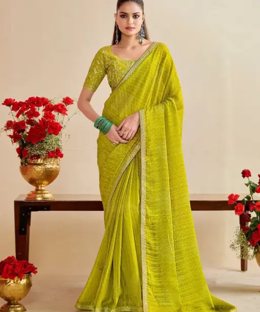 Saree: Moss Chiffon Silk Bandhani Saree with Embroidery Work Lace (Length: 5.50 Mtr)