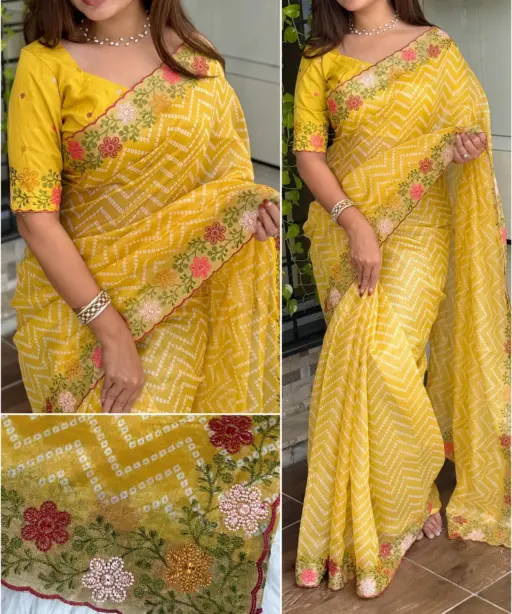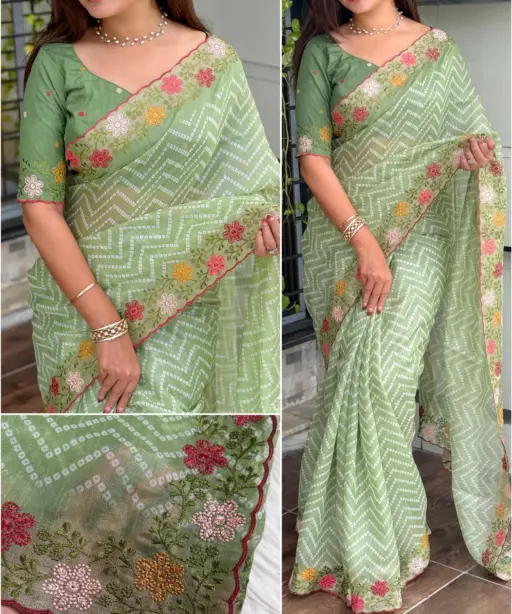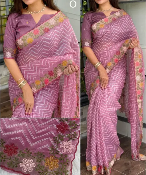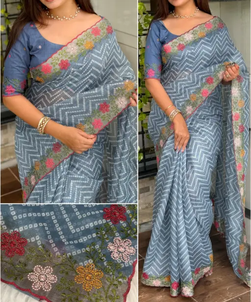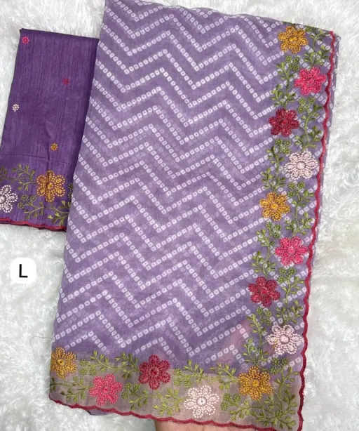 | Saree | Cotton satin (Embroidered work with zari border, Bandhej print) |