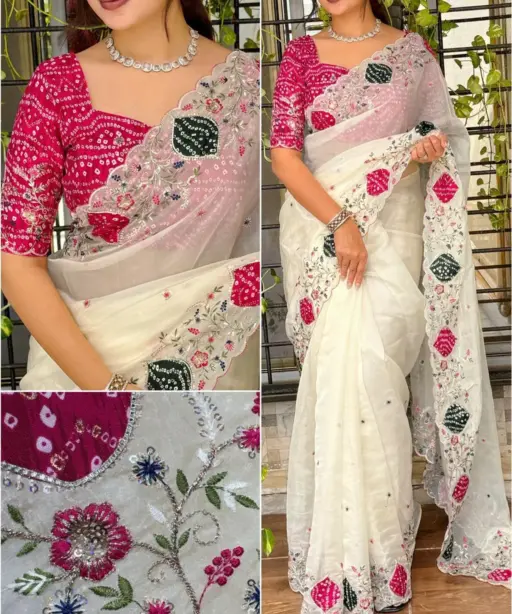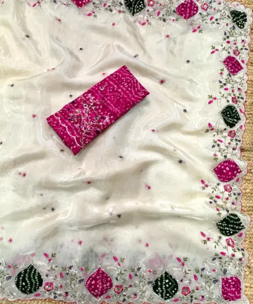 | Saree | Crystal tissue 1-zari embroidered border in full saree, 2-Original Hand applique work in full saree border with bandhej print, 3- zari embroidered work in bandhej print in blouse |