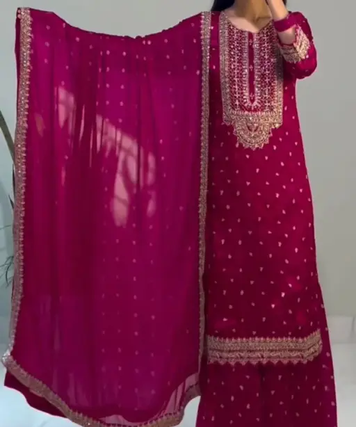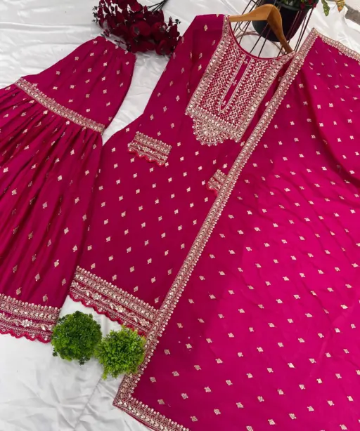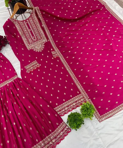 | Bottom (Sharara) | Heavy Chinon Silk with Heavy Embroidery Sequence Work and Flair, Length: 40-41 inches (Fully Stitched) |
