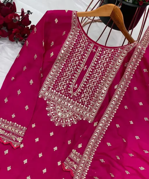 | Top | Heavy Chinon Silk with Heavy Embroidery Sequence Work (Sleeves included), Inner: Heavy Micro Cotton, Length: 43-44 inches (Fully Stitched, Ready to Wear) |