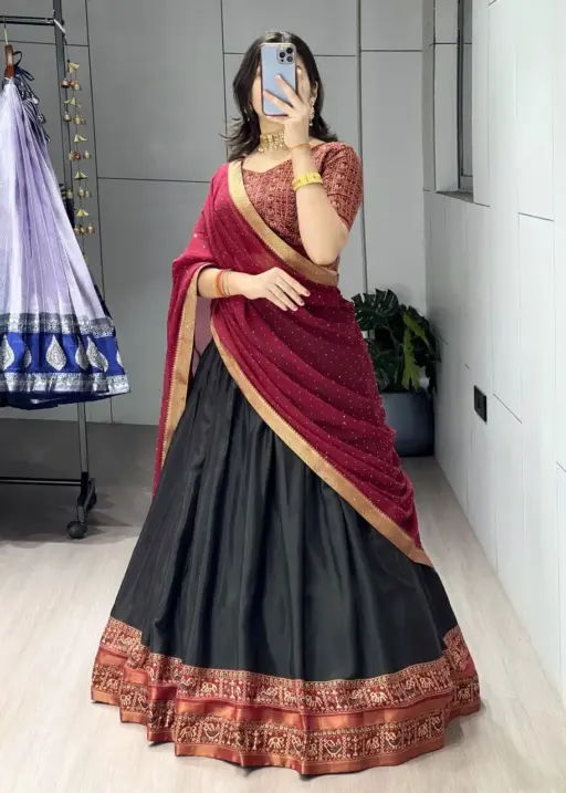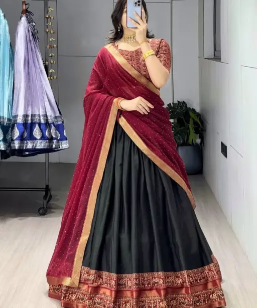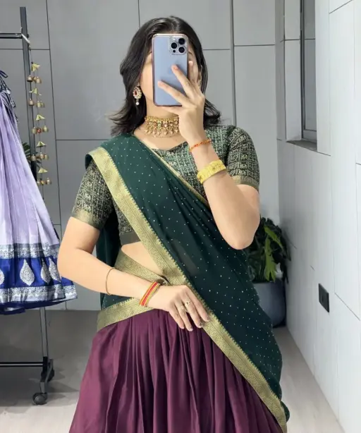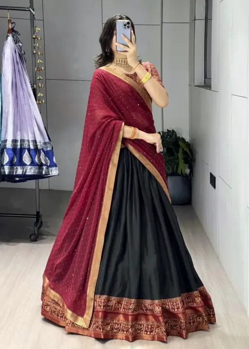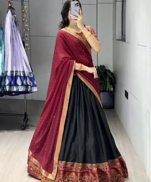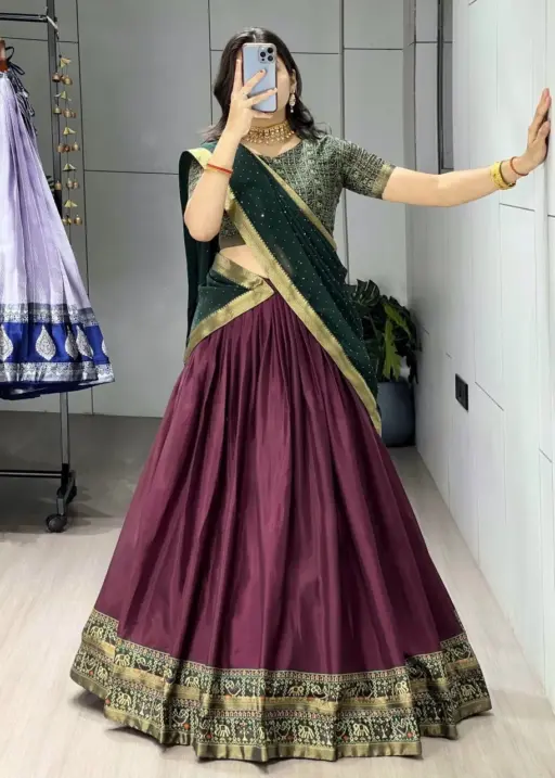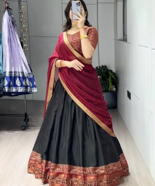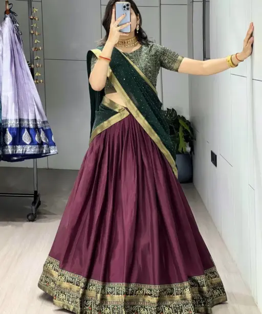 LehengaMul Mul Cotton Plain with Weaving Border and Prints Length: 41, Flair: 4 Meter