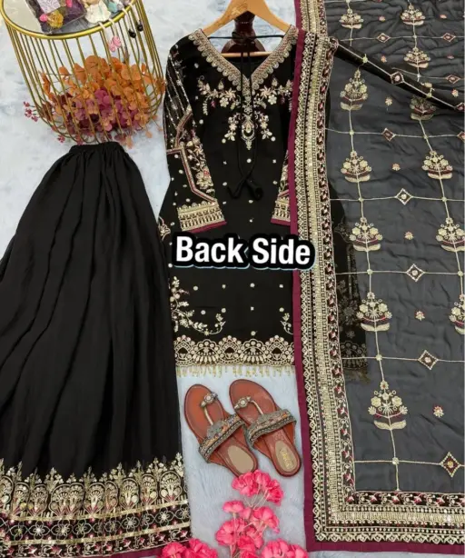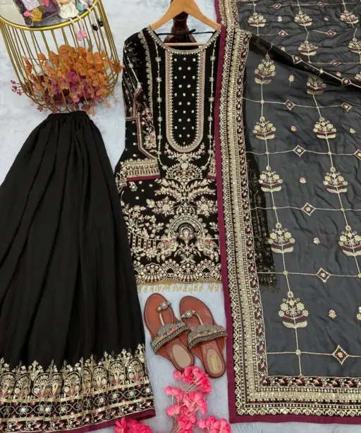 | Top | Heavy Faux Georgette with Heavy Embroidery 5 mm Sequence Work with Rivet Moti Work with Sleeves with Fancy Latkan Border 37-38 Inch Length |