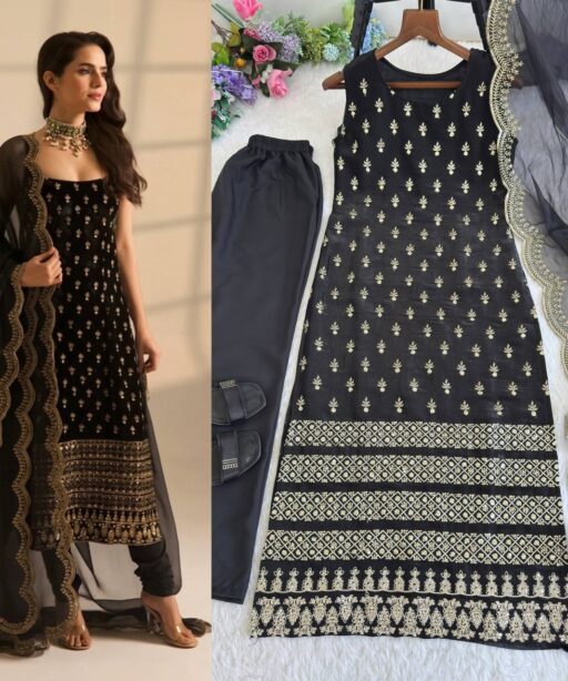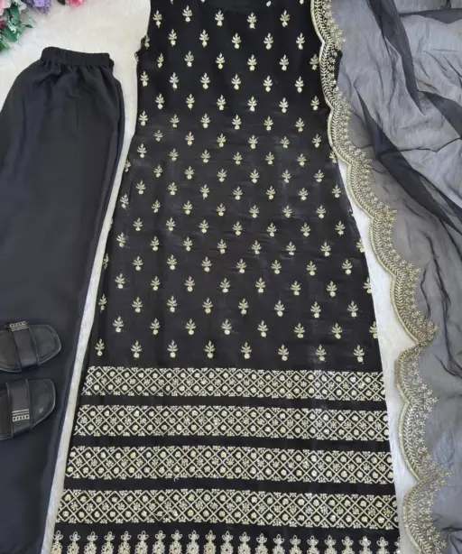 | Top | Roman Glass Satin Soft Micro Inner Golden Coding & Zari Sequence work 48-50 Length |