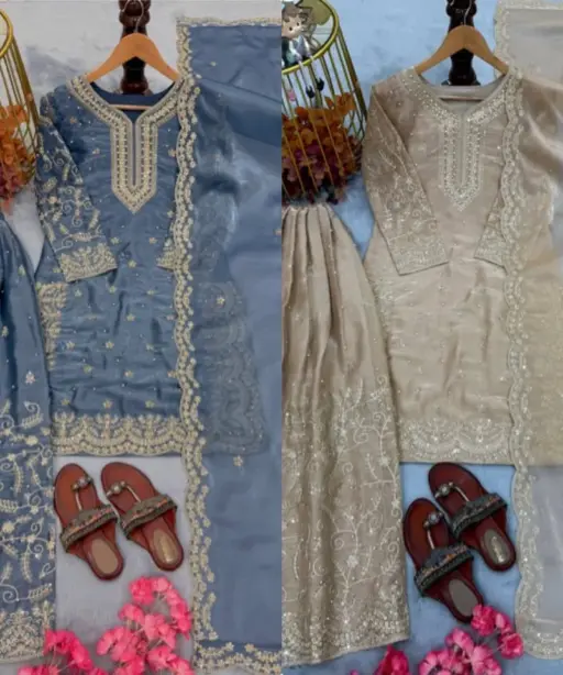 | Bottom | Pur Gmy Silk with Heavy Embroidery 3 mm Sequence & Coding Dori Work with Moti Hand Work 40-41 Inc Length |