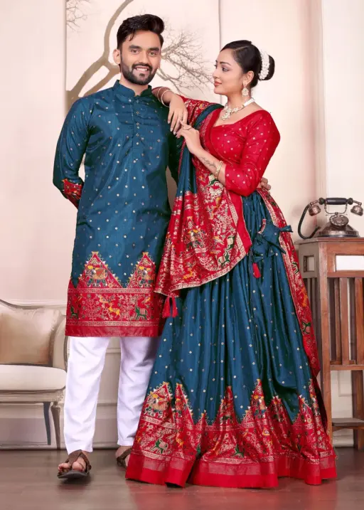 Blue Patola Printed Couple Combo Lehenga and Kurta