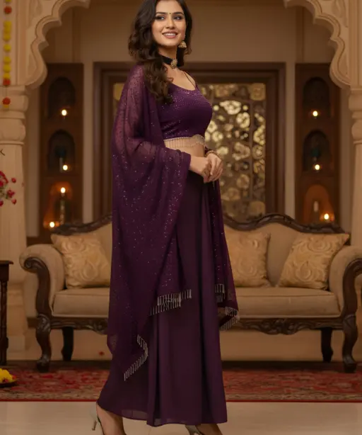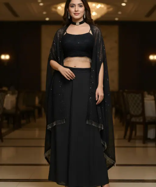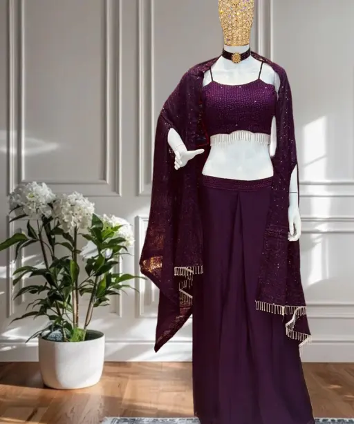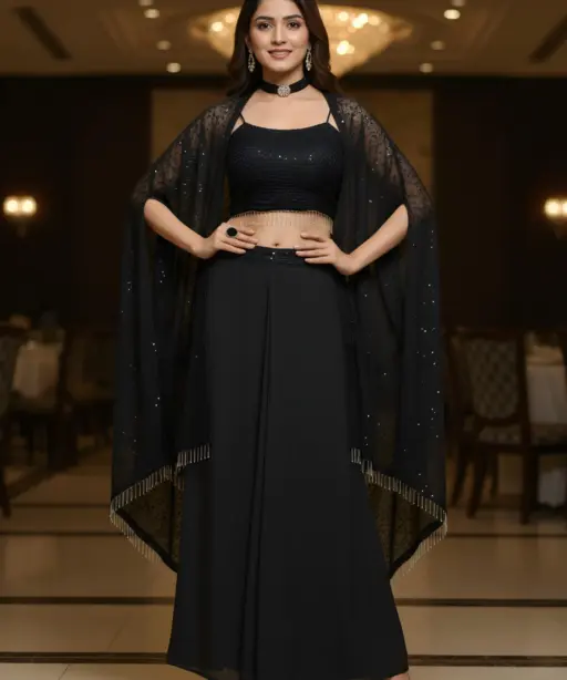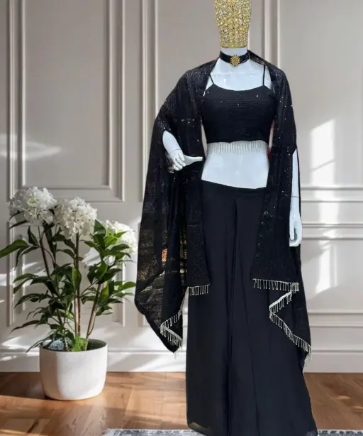 | Bottom | Rangoli Silk Palazzo Skirt with Embroidery Sequence Work (Waist: 42”, Length 44”) |