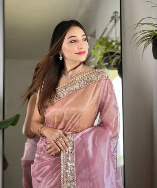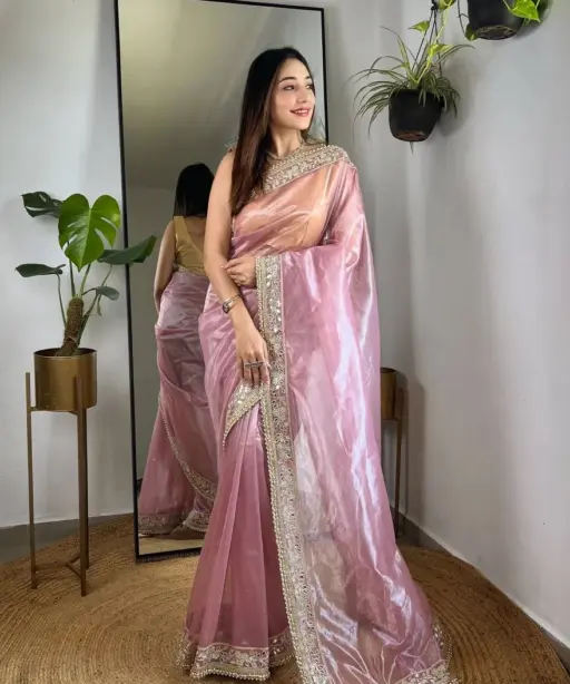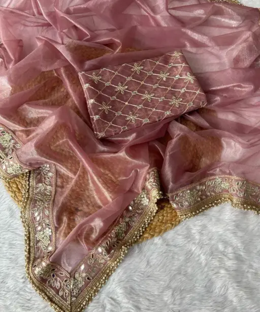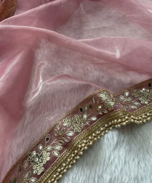 SareeSilver Tissue Silk Work Designer Embroidery with Sequence, Zari Dori & Real Mirror Work Fancy Lace Border with Moti Craft Embroidery