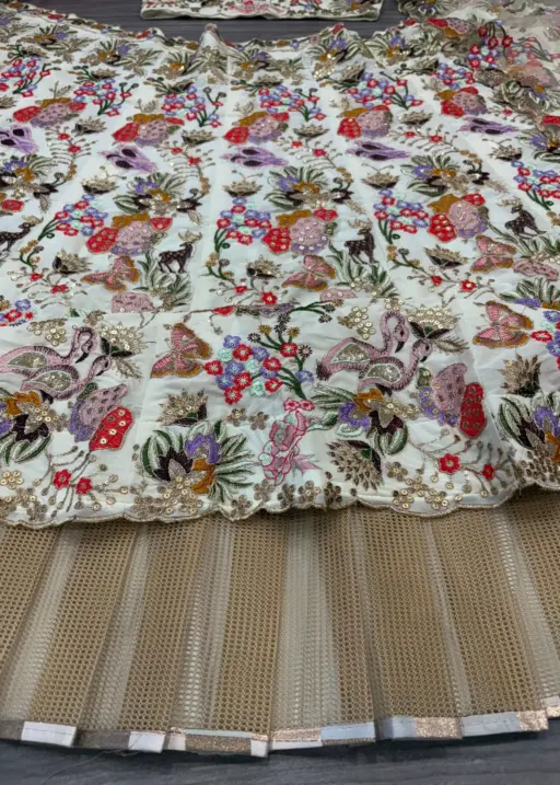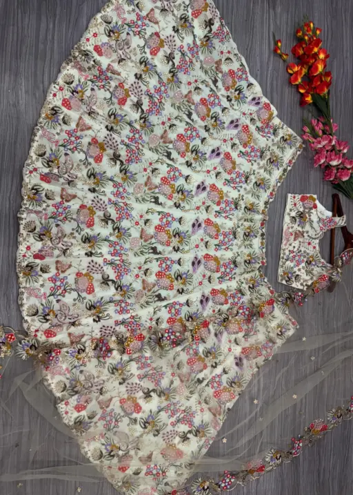 | Lehenga | Premium Faux Georgette embellished with 12-needles heavy multicolor thread embroidery, coding work, jari work, and heavy sequins work. Comes with heavy cancan, canvas, and double inner covering. Flair: 3.5 MTR (Semi-stitched up to XXL). |