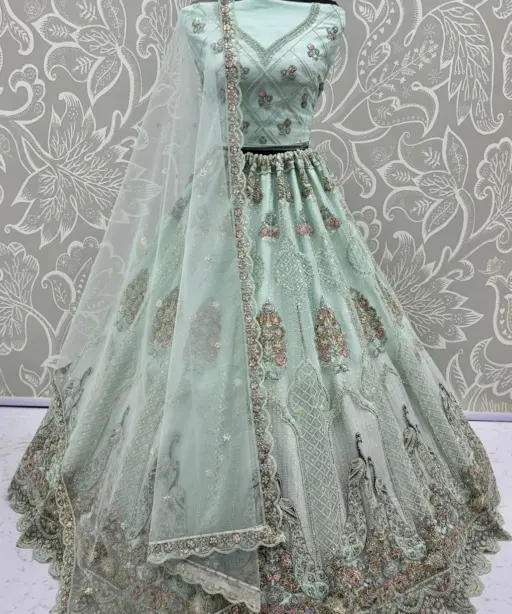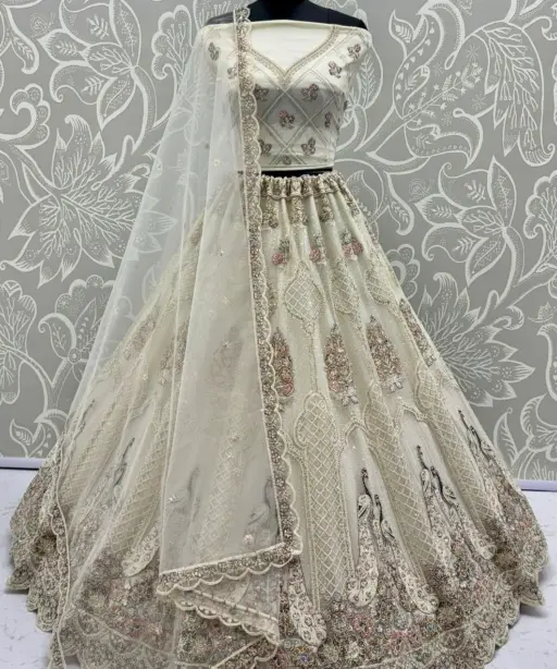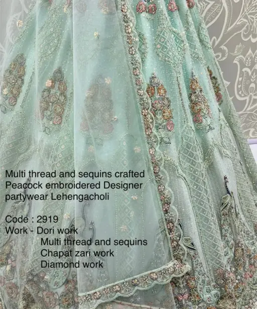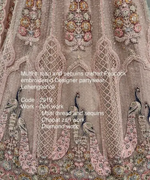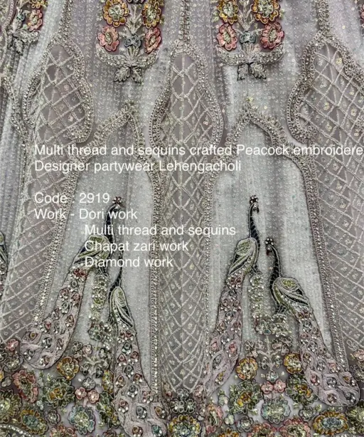 | Lehenga | Heavy Net with Dori Work, Multi Thread & Sequins, Chapat Zari Work, Diamond Work; Standard Stitching with Cancan & Canvas Attached; Size: Free Size up to 42 |