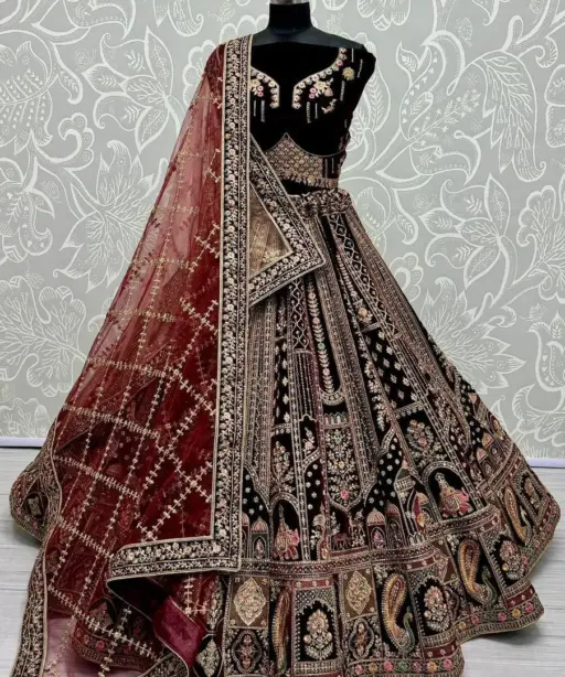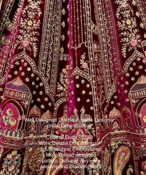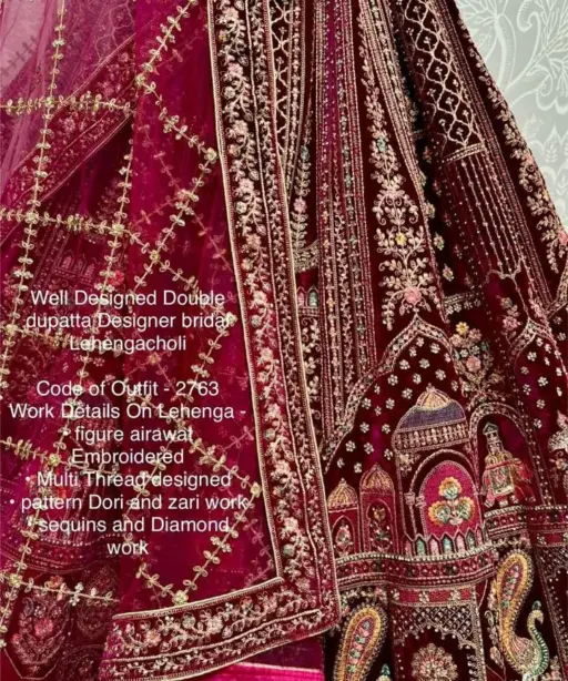 LehengaVelvet with figure airawat embroidered, multi-thread design, Dori and zari work, sequins, and diamond work. Standard cancan and canvas attached. Flair: 4 meters plus