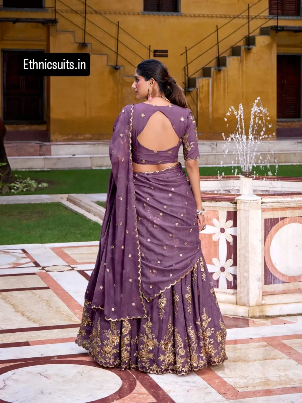 Lehenga: Chocolate Crush with Sequins and Thread Embroidery Work Stitched | Waist Supported up to 42 | Drawstring with Zip | Canvas & Can Can Attached | Length 41 | Flair 3.50 Meter | Inner: Micro Crepe