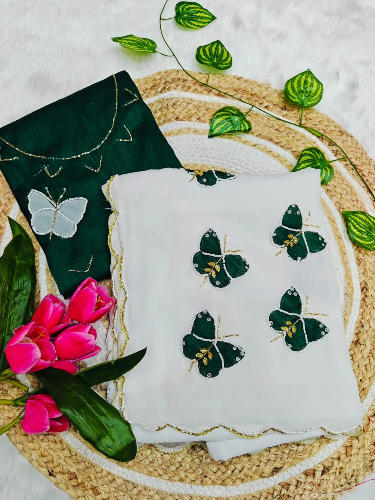 Butterfly Handwork Saree White Green