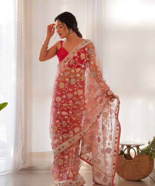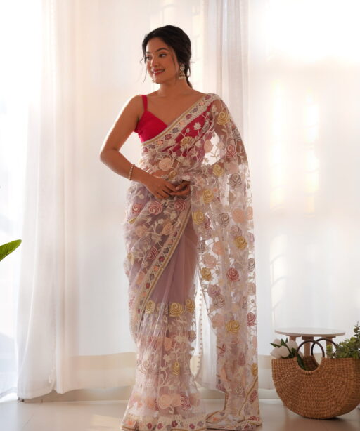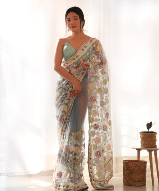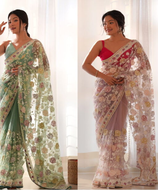 | Saree | Heavy Butterfly Net with Multicolor Aari Embroidery Work and Stone Work |