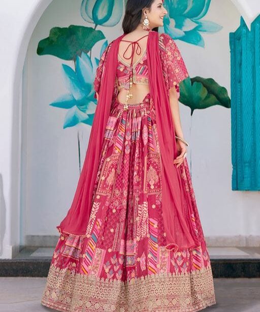 LehengaSemi-Stitched Chinnon Silk dori and zari embroidery work Flair :- 3.50 mtr approx waist-43″ Length-43″