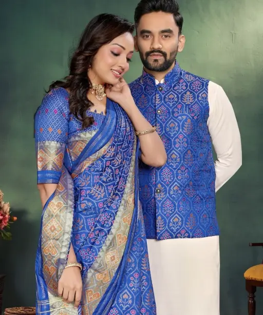 Celebrate love and tradition in style with our Designer Couple Combo Silk Saree with Kurta, exclusively available at EthnicSuits.in. Perfectly curated for couples who want to match their ethnic outfits for weddings, festivals, pre-wedding shoots, or special occasions, this set brings elegance, harmony, and cultural charm to your wardrobe.