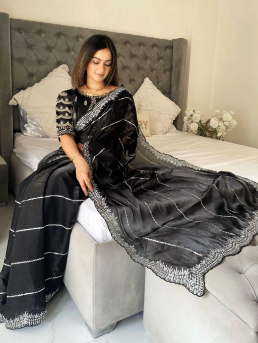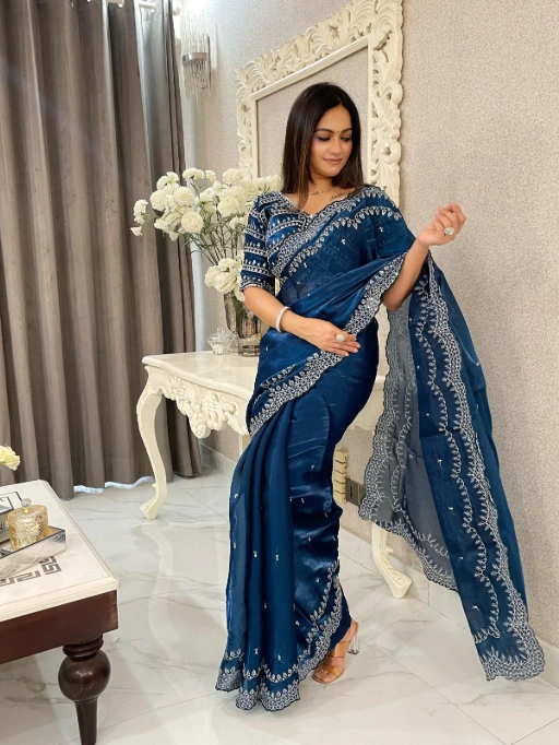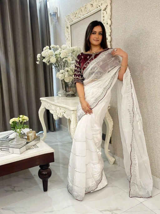 Perfect for women who love to stay ahead of fashion trends while embracing ethnic elegance. Whether you’re attending a cocktail party, family function, or evening celebration, this saree makes you stand out effortlessly.