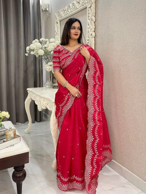 Luxurious Fabric: Shimmer or glossy georgette that reflects light beautifully.