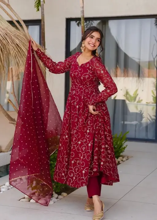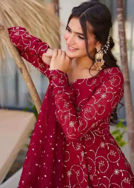 | Top | Heavy Faux Georgette with embroidery sequence work, full sleeves, 45-46 inch length, 4 meter flair, inner heavy micro cotton (Fully stitched & ready to wear) |