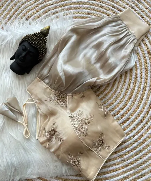 The Zimmy Chu readymade blouse is designed to bring out the diva in you. Made from high-quality fabric, it offers a perfect fit and rich texture. The design features intricate detailing and contemporary cuts, ideal for pairing with sarees, lehengas, or skirts. Whether you’re attending a wedding, festival, or party, this blouse adds a glamorous touch to your ensemble.