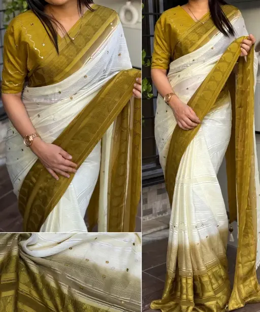 Made from lightweight and breathable fabrics like chiffon or georgette, it’s ideal for long hours and easy draping — no stiffness, no fuss.