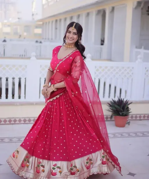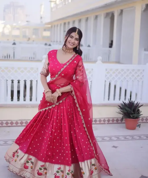 | Lehenga | Dola silk with Meena Weaving With Sequins coding Embroidered lace Work. Length 42, Flair 3 Mtr |