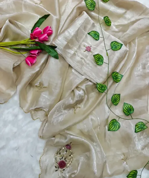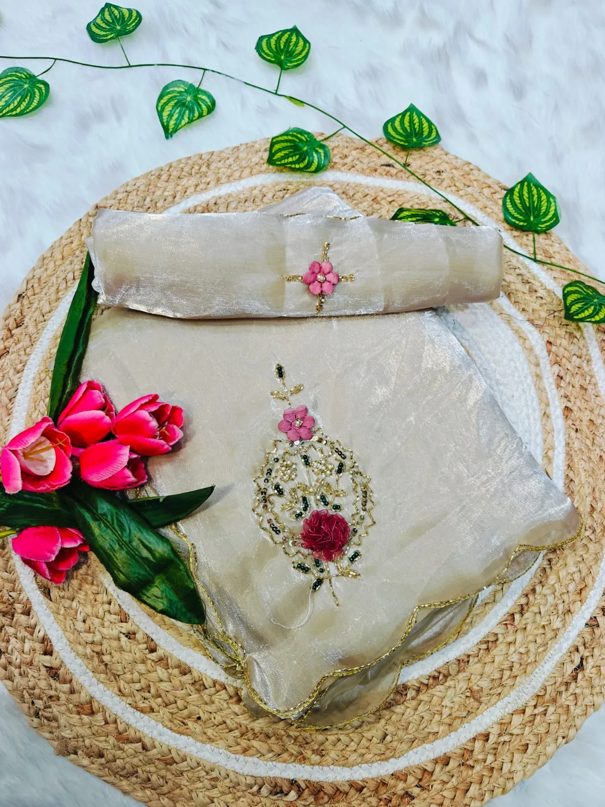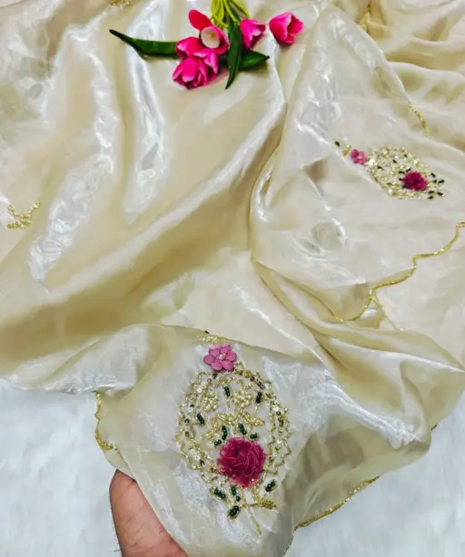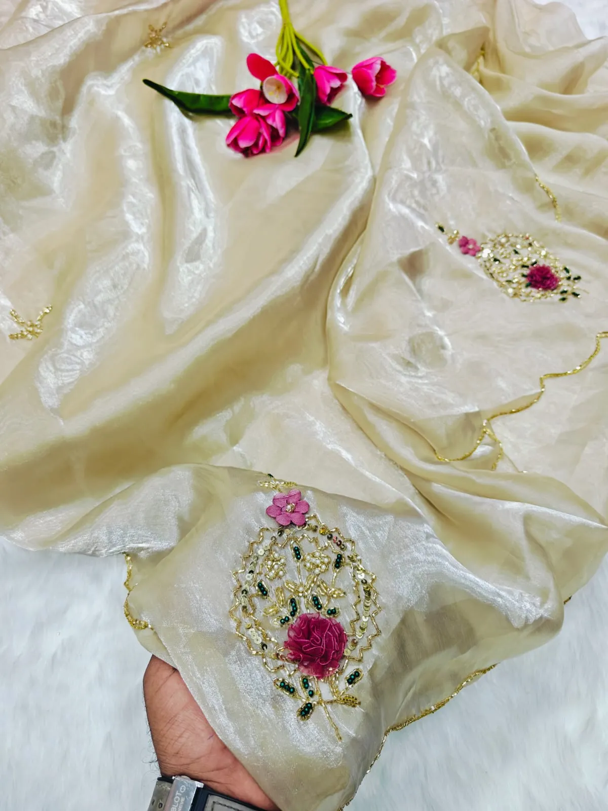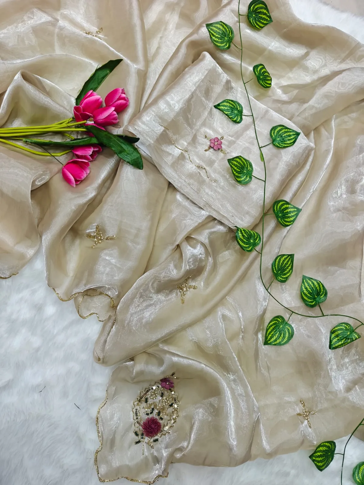 | Saree | party wear Traditional Beage color soft jimichu silk with Beautiful heavy cutdana and sequence handwork design in pallu and full body butta design with beautiful eligent cut work full border |