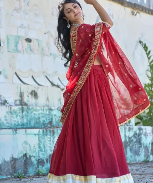 | Lehenga | Heavy Georgette, Plain with Patta in Daman, Stitched with Canvas and attached with Can Can |