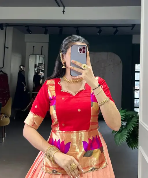 | Blouse | Jacquard Silk with Zari Weaving Work and Lace Touch Up (Fully Stitched Size 38, Margin Adjustable from 36″ to 42″) |