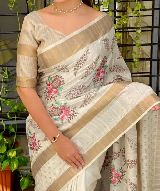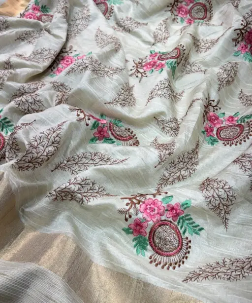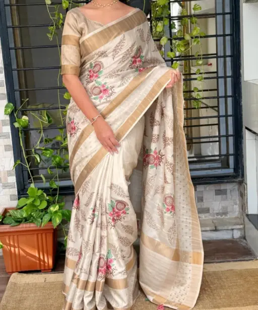 | Saree | Pure tusser cotton Work: 1- Multi Thread work in full saree, 2-Zari jacquard weaving pallu in saree with zari border, 3- zari weaving pattern in blouse, 4-multicolor Cotton tussles in pallu |