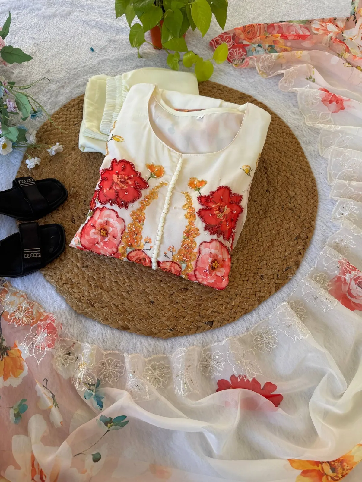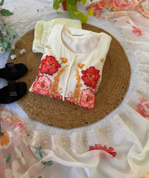 Creme Georgette Floral Handwork Gown with Dupatta