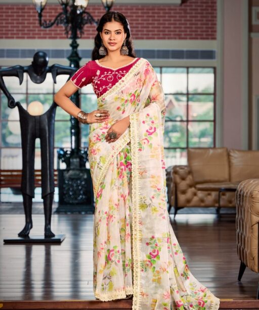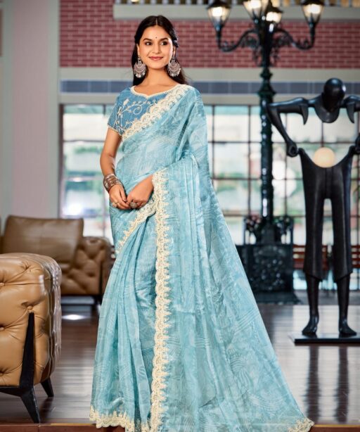 | Saree | Heavy Burberry Fabric With Fancy Embroidered Cutwork Border & Designer Embroidered Blouse |