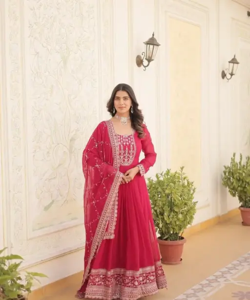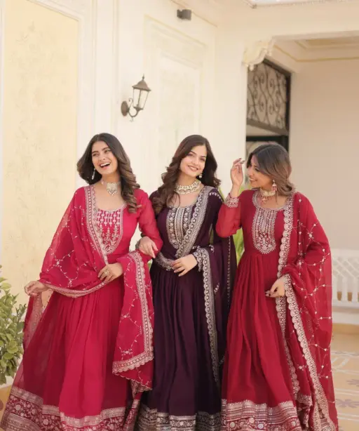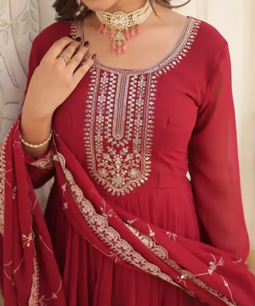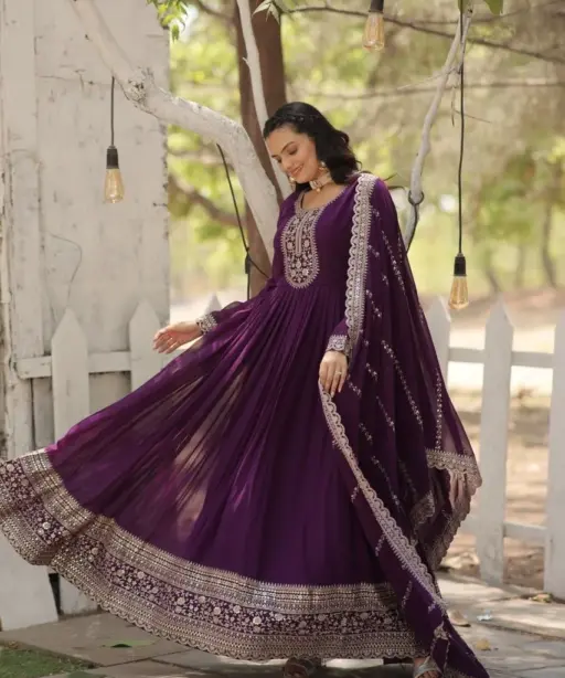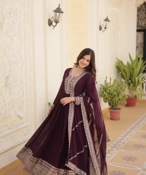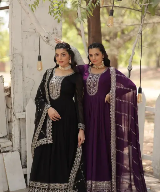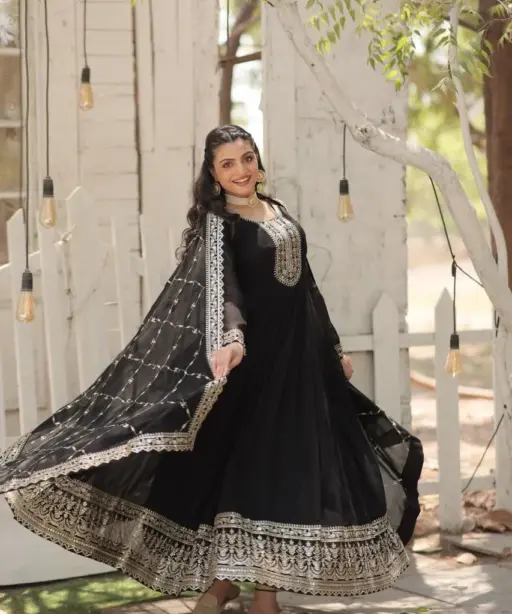 | Top | Faux Blooming Gown with Rich Sequins Embroidered Work, Full Sleeves, Round Neck, Stitched with Canvas Patta |