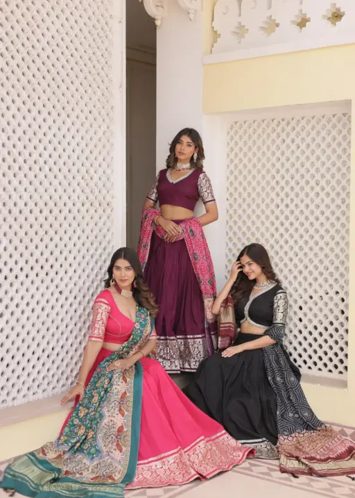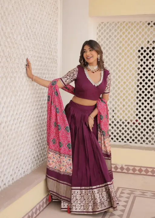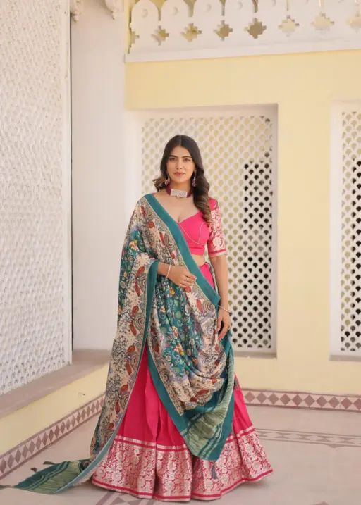 LehengaViscose Jequard, Length: 42”, Waist: 42”, Inner: Cotton, Flair: 3.5 Mtr, Closure: Chain Attached & Dori Latkan, Stitching Type: Stitched Can-Can And Canvas