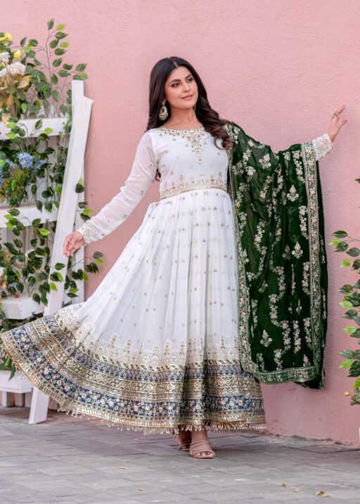The gowns with dupattas in this collection are adorned with intricate embroidery, zari work, and delicate embellishments, adding a regal and traditional touch. Whether you’re looking for a classic design or a more contemporary look, our festive wear gowns come in a wide range of colors, from vibrant reds and golds to soft pastels and elegant neutrals.