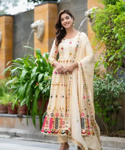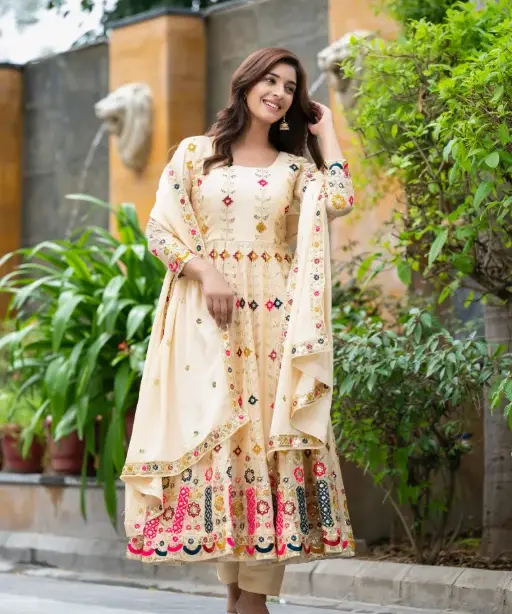 This stunning Anarkali suit is crafted from premium-quality fabric that drapes beautifully while offering maximum comfort. The floor-length silhouette flows gracefully, enhancing your natural poise with every step. What sets this outfit apart is the multicolor embroidery work, skillfully done by artisans to reflect the beauty of traditional Indian design with a modern twist.