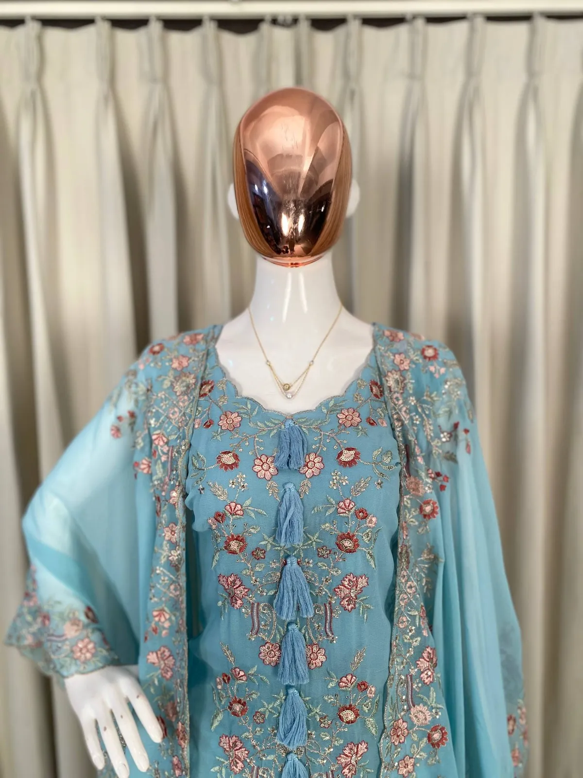 DupattaFAUX GEORGETTE SEQUENCE EMBROIDERY WORK FRONT AND BACK SIDE WITH TUSSLES ON CORNERS
