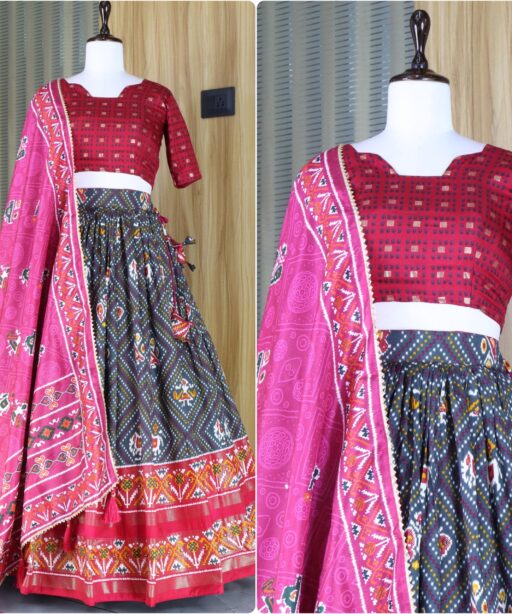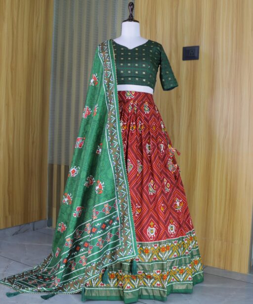 | Top | Pure Tussar Silk Lehenga Work : Patola and Bandhani Print with foil work Waist : SUPPORTED UP TO 42 Lehenga Closer : Drawstring With Heavy Hand Made Tassels and Zip Stitching : Stitched With Canvas and attached with Can Can Length : 41 Flair : 3.8 Meter |