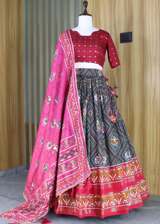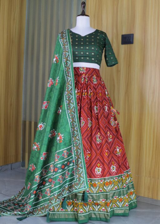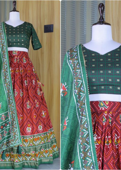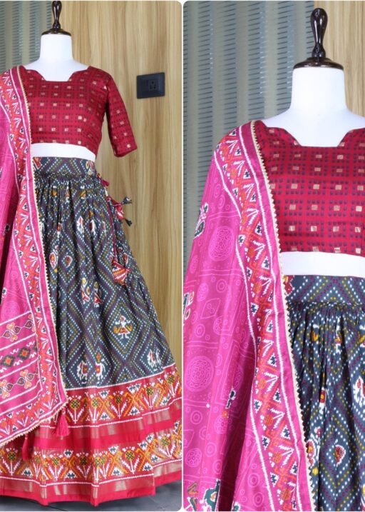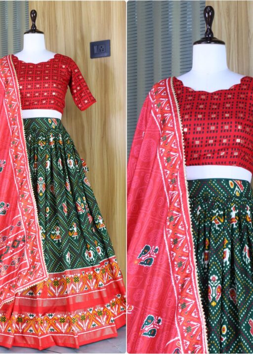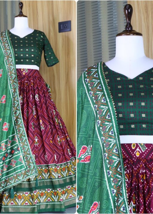 Lehenga Work : Patola and Bandhani Print with foil work