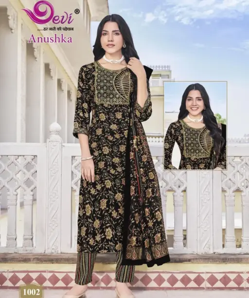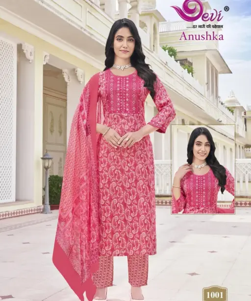 Devi Anushka Vol 1 – Kurti Pant With Dupatta Rayon Printed 3Piece Kurti Set Wholesaler