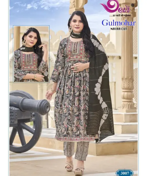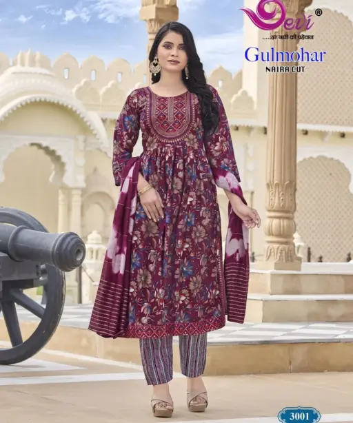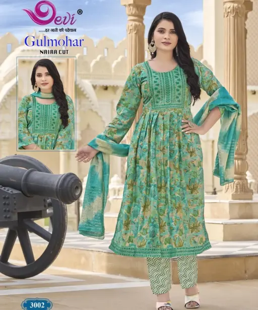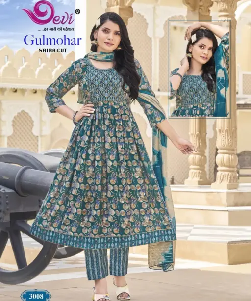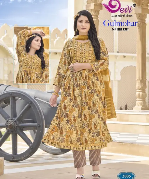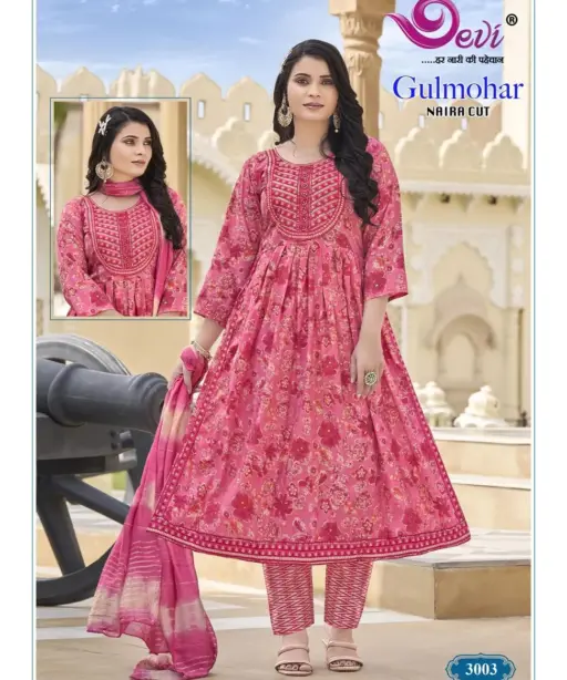 Devi Gulmohar Vol 3 Nayra Cut Printed Kurti Set Ethnic